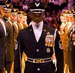 The Mess dress uniform is worn to formal or semi-formal occasions such as dinings-in and dinings-out, the annual Air Force Ball, weddings and other formal functions where civilian "black tie" would be prescribed. The current mess dress uniform in use since the early/mid-1980s consists of a dark blue mess jacket and mess dress trousers for males and a similar color evening-length skirt for females; as of August 2020, females have the option to wear mess dress trousers.[15] The jacket features ornate silver buttons, and is worn with the service member's awarded medals in miniature size, wings in miniature size, or other specialty insignia over the left breast, command insignia over the right breast for colonels and below (if applicable), satin air force blue bow-tie for males or tab for females, and a satin air force blue cummerbund. Cufflinks can be either shined or flat round silver or have the air force star and wing emblem. Dark blue suspenders may also be worn, but remain hidden while the jacket is on. Commissioned officers, USAFA and AFROTC cadets, and OTS officer trainees wear hard shoulder boards similar to those worn by commissioned officers of the U.S. Navy. Commissioned officer shoulder boards for colonels and below feature an officer's rank insignia in raised metallic thread, bordered by two silver vertical metallic stripes similar to sleeve braid. General officers wear shoulder boards covered nearly the entire length and width in a silver metallic braid, with silver stars in a raised metallic thread in number appropriate to their rank. Enlisted personnel typically wear the same large rank insignia that they would wear on their service dress coats. Officers also wear a single silver metallic sleeve braid on the lower sleeves of the Mess Dress coat, with sleeve braid coming in two widths, in a 1/2 inch width for colonel and below, and in a 3/4 inch width for Brigadier General and above. Enlisted personnel normally wear no sleeve braid. No hat or nametag is worn with the Air Force Mess Dress Uniform.[14]