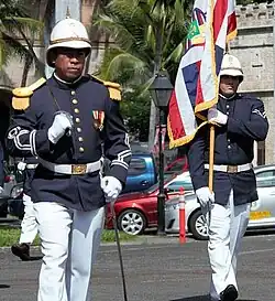 During the late 19th century, the Hawaiian Queen's Guard was responsible for protecting Royal Family of the Kingdom of Hawaii. It was disbanded in 1893 following the annexation of Hawaii by the United States, overthowing Queen Lili'uokalani and installing Sanford Dole as governor of the new territory.[31]