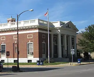 The United States Post Office is a historic building located in downtown Iowa Falls, Iowa, United States. Built in 1914, the structure was designed in the Neoclassical style, with Oscar Wenderoth as the supervising architect. The 1893 Colombian Exposition in Chicago was a major influence in the building's design.[2] The foundation is composed of North Carolina granite, while the walls are dark red brick that is laid in an English cross bond. The main entrance is framed by a portico that is held up by four columns of the Doric order. The interior features woodwork of white oak, a marble-terrazo floor, and a vaulted ceiling. It was listed on the National Register of Historic Places in 1994.[1]