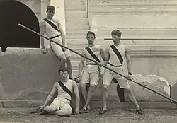 Several members of America's first Olympic team in 1896. Standing: T.E. Burke, Thomas P. Curtis, Ellery H. Clark. Seated: W.W. Hoyt, Sumner Paine, Trainer John Graham, John B. Paine, Arthur C. Blake