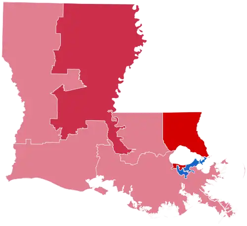 Bush performed better here than he did in 2000. He won four more parishes: Caddo, Bienville, Saint Landry, and West Baton Rouge, but he won each with very slim margins of victory of less than two percent, except for West Baton Rouge which he won with 54 percent of the vote, indicating that parish as trending Republican. In the northern portion of the state, Bush barely lost in Madison and Tensas. The only two parishes in which he got less than forty percent of the vote were East Carroll and Orleans. Bush also won six of seven congressional districts in the state, each with at least 58 percent of the vote. The Second District, which covers the parish and city of Orleans, was won by Kerry with seventy percent of the vote; in other words, no congressional district in the state was competitive. As of the 2024 presidential election, this is the last election in which East Baton Rouge Parish and Caddo Parish voted for a Republican presidential candidate.[8] Conversely, this is the last election in which Assumption Parish and Pointe Coupee Parish voted for a Democratic presidential candidate.[8]