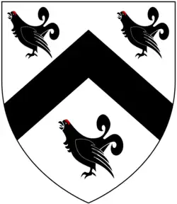 - ^ The roundels on the label are stated by some sources to be "plates" (with tincture argent (white)) but in others to be "bezants" (with tincture or (gold)). These are the ancient arms of the Courtenay Earls of Devon differenced by a label which itself is further differenced by charges