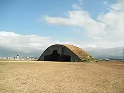 During World War II, the Usa Naval Air Group (宇佐海軍航空隊, Usa Kaigun Koukūtai) was stationed at an airbase in Usa. Towards the end of the war, the airbase was used to launch kamikaze attacks against American forces. It was subject to B-29 air raids in 1945 which led to the destruction of many of the airfield's facilities and caused the deaths of many soldiers and civilians.[5] Many remnants of the former airfield are still visible. For example, there are several concrete bunkers which once held A6M Zero fighter aircraft. There is also a crater called the "bomb pond" which was caused by a bomb from an American B-29 bomber.[5]