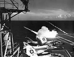 An RIM-2 Terrier SAM missile is fired by USS Constellation in 1962. In the foreground are aircraft from VF-131 and VA-133