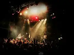 In February 2013, Vamps announced they were changing record labels to Universal Music Group's Delicious Deli Records.[8] The first release on the label was the home video Vamps Live 2012 on April 24, which was recorded at Zepp Namba in 2012.[8] Vamps, who were recording in Los Angeles, performed at the 2013 MTV Video Music Awards Japan on June 22, coming straight from the airport.[9] This was the first performance of the songs from their double A-side single "Ahead/Replay",[9] which was released on July 3, exactly one year and one day since their debut five years ago.[10] The duo released the best-of album Sex Blood Rock n' Roll on September 25, which includes re-recordings of songs, all in English, and is also their first worldwide release.[11] They supported the record with a world tour that took them to Barcelona, Paris, Berlin, London, and finished with shows in Los Angeles and New York where they were supported by Sid Wilson of Slipknot.[12][13]