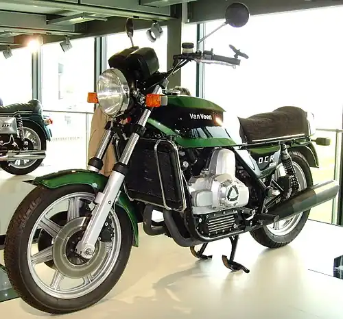 Van Veen completed its first prototype in 1974 using a 1000 cc Comotor 624 twin-rotor Wankel engine, and in November 1974 it was exhibited at the Cologne motorcycle show with front and rear cast wheels and triple Brembo disc brakes.[3]