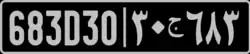 Djibouti requires its residents to register their motor vehicles and display vehicle registration plates.[1] The current version started in 2023 are European standard (520 mm × 110 mm (20 in × 5 in)); black texts on white background; used FE-Schrift typeface for alphanumeric and Square Kufic typeface for Arabic text.[2]