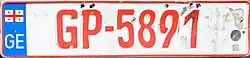 A new, European-style of registration plate was introduced on 1 September 2014. These have sets of two letters first and last (like French and Italian registration plates), with three numerals in the middle. A blue strip on the left contains the Georgian flag and a "GE", and there is a small security hologram on the bottom right.[2] As additional security features, the plates have a watermark-like symbol of the LEPL Service Agency of MIA of Georgia and a machine-readable data matrix code near the hologram. The old style plates with three letters, a hyphen and three numbers (e.g. ABC-775), in black on a white background, became invalid in September 2020. To accommodate owners of imported North American or Japanese vehicles, a more square styled plate is also available.[2]