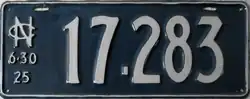 1924–25 Embossed white serial on dark blue plate with border line; "NC" monogram and "6-30 25" at left none 123.456 1 to approximately 320.000