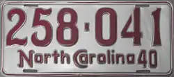 1940 Embossed maroon serial on silver plate; "North Carolina 40" centered at bottom none 123-456 200-001 to approximately 705-000