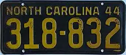 1944 Embossed golden yellow serial on black plate; "NORTH CAROLINA 44" at top none 123-456 200-001 to approximately 707-000
