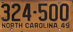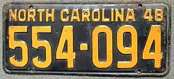 1947 Embossed black serial on golden yellow plate; "NORTH CAROLINA 47" at top none 123-456 100-001 to approximately 682-000 Serials 800-001 through 999-999 reserved for trucks and farm vehicles; this practice continued through 1949.[4]