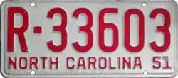1951 Embossed red serial on white plate; "NORTH CAROLINA 51" at bottom none 123-456 100-001 to