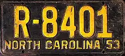 1953 Embossed golden yellow serial on black plate; "NORTH CAROLINA 53" or "N.C.", slogan and "53" at bottom (see right) none, or "DRIVE SAFELY" between state abbreviation and year 123-456 100-001 to