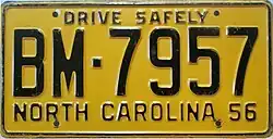 In 1956, the United States, Canada, and Mexico came to an agreement with the American Association of Motor Vehicle Administrators, the Automobile Manufacturers Association and the National Safety Council that standardized the size for license plates for vehicles (except those for motorcycles) at 6 inches (15 cm) in height by 12 inches (30 cm) in width, with standardized mounting holes.[2] The 1955 (dated 1956) issue was the first North Carolina license plate that complied with these standards.