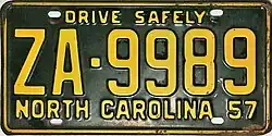 1957 Embossed golden yellow serial on black plate with border line; "NORTH CAROLINA 57" at bottom "DRIVE SAFELY" centered at top A-1234