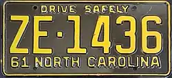 1961 As 1957 base, but with "61 NORTH CAROLINA" at bottom "DRIVE SAFELY" as on 1957 base A-1234