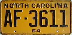 1964 Embossed black serial on golden yellow plate; "NORTH CAROLINA" at top; "64" centered at bottom none A-1234