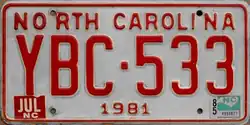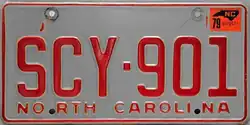 1975–78 Embossed red serial on reflective white plate with border line; vertical "75" used as separator; "NORTH CAROLINA" at bottom "FIRST IN FREEDOM" centered at top ABC-123 AAA-101 to approximately PMZ-999 First base to be revalidated with stickers. Monthly staggered registration introduced 1981.[5] Plates from AAA-101 through JAY-999 replaced 1982; all other plates replaced by 1992.