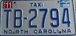 Taxi 2006–present Embossed blue on white with border line; "NORTH CAROLINA" at bottom; "TAXI" at top TB-1234 TA-1001 to present Issued annually through 2005.[9] Issuing TC series as of August 19, 2019.