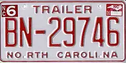 Trailer 1995–present Embossed red on white with border line; "NORTH CAROLINA" at bottom; "TRAILER" at top AB-12345 AN-10000 to