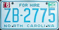 For Hire 2006–present Embossed blue on white with border line; "NORTH CAROLINA" at bottom; "FOR HIRE" at top ZB-1234 ZB-1001 to present Issued annually through 2005.[9] Issuing ZM series as of September 27, 2020.