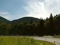 The southwestern slope is traversed by the serpentine national road 44 from Šumperk to Jeseník.[3] This road is unique in its course, originally laid out in the 19th century to connect with the developing tourist base at Červenohorské sedlo pass. It was later asphalted in the 20th century and modernized and repaired between 2014 and 2016.[8] To cover a straight-line distance of 2.6 km with an elevation difference of 405 meters (from the bridge in Kouty nad Desnou at 603 m above sea level to the Červenohorské sedlo pass at 1,008 m above sea level), a road 7.7 km long had to be built to moderate the slope gradient. The road includes nine road loops at elevations of 609, 620, 699, 770, 800, 832, 865, 897, and 922 m above sea level. The road is secured with guardrails along the mountain side, offering views towards many nearby peaks such as Dlouhé stráně, Medvědí hora, Suchá hora, and, at higher elevations, the tower on Praděd.[3]