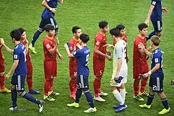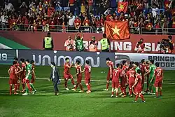 Vietnam came to the tournament with a team mostly constituted of players with little experience in international competitions. The team had a positive performance in the opening match, losing 2–4 to title contender Japan and leading 2–1 at one point during the game. However, Vietnam then lost 0–1 to direct competitor Indonesia and was soon eliminated from the group stage, marking their first defeat to Indonesia after 7 years.[79][80] In the final group stage game against Iraq, Vietnam had a good start while leading 1–0 after the first half, but the team soon fell into a disadvantage position after Khuất Văn Khang was sent off. Iraq quickly led 2–1 before Nguyễn Quang Hải equalized in the 89th minute. In the last minute of the game, Iraq was awarded a penalty and converted it, ending the match as 2–3 lost for Vietnam, forcing them to leave the tournament with 0 points.[81]