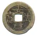 The first cash coins of the Lý dynasty produced during the reign of Emperor Lý Thái Tổ were the Thuận Thiên Đại Bảo (順天大寶), these were among the largest early Vietnamese cash coins with a diameter of 25.5 millimeters.[19][20] All known variants of this cash coin feature the Chinese character Nguyệt (月) on the top of their reverse sides.[19]