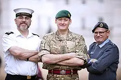 A Reservist from each of the three main reserve services. From left, a Royal Naval Reservist, Army Reservist and Royal Air Force Reservist.