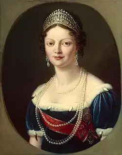 The Napoleonic Wars had drastically changed the balance of power in Europe, but especially in Germany. There Napoleon had reorganized the territories of the former Holy Roman Empire into several new French satellite states. Among those was the Kingdom of Württemberg, ruled by King Frederick I, previously Duke Frederick III, who had been coerced into alliance with Napoleonic France. In exchange for fealty to France and auxiliary Württemberger troops, Frederick was rewarded with land from smaller German states and increased rank and status. At the Congress of Vienna, Frederick was able to keep his gains thanks to his connections to the United Kingdom and the Russian Empire. While traveling to England in 1814, William, Crown Prince of Württemberg, met Grand Duchess Catherine Pavlovna of Russia, his cousin and a recent widow.[2][3] The two fell in love,[2] but William was already married to a Bavarian princess, Caroline Augusta of Bavaria.[4] The pair met again in Vienna and resolved to marry,[2] leading William to obtaining a speedy divorce from Princess Caroline on the basis of non-consummation.[4] That same year, 1816, Catherine and William were wed, strengthening already strong ties between Württemberg and Russia.[3][4][5]