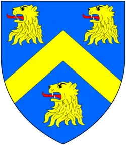 Arms of Wyndham: Azure, a chevron between three lion's heads erased or