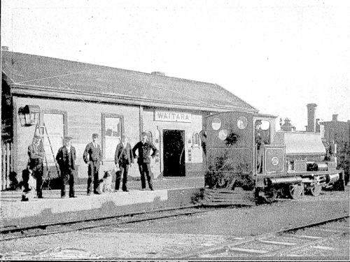 ![]() Waitara Railway Station in 1904, with an F-class locomotive in the yard. | |||||
