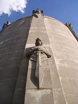 The tower was one of the last projects of Harry Wild Jones, an architect known for several other Minneapolis landmarks including Butler Square and Lakewood Cemetery Chapel.[3] It was intended to add beauty to the developing neighborhood and to create jobs during the Great Depression. Along with William S. Hewett (an engineer from the Interlachen Bridge project), he incorporated modern hydro-engineering methods into the tower's design. The story goes that as Jones was clearing underbrush at his home nearby, which was also in its construction phase, a giant eagle (with nearly an 8-foot (2.4 m) wingspan) had attacked him. He had the eagle maimed, captured, and brought to town where it began attracting much attention. In part, he used the eagle's extraordinary dimensions (and the artistic skills of John Karl Daniels) to cast the eight concrete lookalikes which now sit atop the tower, watching over their former domain. Eight 18-foot-tall (5.5 m) "Guardians of Health" were also placed around the tower to prevent any bad-tasting or bad-smelling water pollutants, which were thought to be the cause of typhoid fever outbreaks, from contaminating the water supply.[4]
