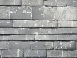 Structurally, the building is timber-framed[15] and uses a mixture of reclaimed wood and plywood from various sources around Brighton. It has been constructed on foundations of ground granulated blast-furnace slag.[4][13] The "rather unusual"[15] walls consist of a mixture of waste chalk and clay left over or reclaimed from building sites.[15] These are compressed into rammed earth-style walls using pneumatic equipment—a technique which improves the building's energy conservation, because such walls store solar energy for a long time.[12] On the outside the walls are covered with "a scaly surface of rubbery black shingles"—2,000 carpet tiles from an old office building in Brighton. Their fire-retardant, waterproof underlay faces outwards, providing weatherproof cladding and insulation.[2][4] Their mostly black appearance is varied in places by being laminated with plastic bags in various colours.[7] Between the carpet tiles and the walls themselves, some new material was used: DuPont supplied about 400 square metres (4,300 sq ft) of "breathable membrane", to further weatherproof the building, and "Housewrap" moisture seal.[15] Inside, the walls are laid with reclaimed plasterboard coated with surplus paint from construction sites.[2] The main load-bearing wall is formed of 10 tonnes of compressed chalk spoil from a building site nearby.[4] Throughout the building, the space between the boarding and the exterior clay and chalk blocks has been filled with household rubbish which will act as insulation. Sensors have been installed to monitor how well heat is kept in,[4] which will form part of a PhD project for a University of Brighton student.[12][7] The insulation materials are revealed in various places by "little peephole windows"[2] (transparent panels in the walls):[4] as well as some secondhand conventional (polyurethane) insulation material,[2] there are floppy disks, 4,000 VHS cassettes, 4,000 DVD and video cases, two tonnes of denim offcuts from pairs of jeans and denim jackets, cycle inner tubes to insulate windows, and 20,000 toothbrushes.[2][4] The cassettes and other media came from the stock of rental shops which were closing down; an aeroplane cleaning company at nearby Gatwick Airport donated most of the toothbrushes, which were provided to First and Business Class passengers and discarded after one use,[12] and some others were provided by Brighton schoolchildren; and the denim came from textile traders[4][2][7] (in particular, one company which turned imported jeans into denim shorts by cutting off the legs).[2]