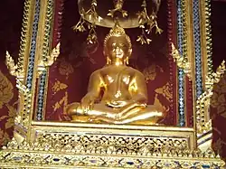 There are many legends about the origin of Phra Saekkham (พระแซกคำ, Lao: ພຣະແຊກຄໍາ), the principal Buddha image of this temple.[2][3] The Maravijaya attitude image was said to be created during the Queen Camadevi's reign, the first ruler of Haripuñjaya. Its ownership passed through the hands of various kingdoms, from Lan Na to Lan Xang to Vientiane.