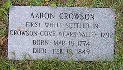 Crowson arrived in Wear Cove from North Carolina in 1792 along with his friend, Peter Percefield. This was a period of elevated strife between the Cherokee and the fast-encroaching Euro-American settlers. Wear's Fort was attacked in 1793, with Wear leading a punitive march against the Cherokee village of Tallassee shortly thereafter. In May 1794, Percefield was killed in a Cherokee attack. Crowson rode to Wear's Fort to get help, but the Cherokee had fled by the time he returned. Several settlers marched onward to Great Tellico to the west, where they murdered four Cherokee while they slept. Percefield was buried on a hill in the eastern half of Wear Cove in what is now Crowson Cemetery. Later that year, Crowson received a land grant for this plot of land.[1]