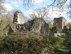 Ewloe Castle (Welsh: Castell Ewlo) is a native Welsh castle near the town of Ewloe in Flintshire, Wales. The castle, which was one of the last fortifications to be built by the sovereign Princes of Wales, was abandoned at the beginning of the invasion of Wales by Edward I in 1277.[3] Its construction, using locally quarried sandstone, appears to have continued piecemeal over many years and may have not been completed. The Welsh sited Ewloe on high ground standing near the Chester road, it maintained a strategic position near the Wales–England border. The castle is located on a steeply sloped promontory within a forested valley. It overlooks the junction of two streams with higher ground to the south. The castle is a 1 km walk from the visitor centre and free to enter. The castle is unique because of its D-shaped keep known as 'The Welsh Tower'[4] and is managed by CADW.