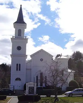 West Brattleboro was the site of the town's second church (built in 1785), and the area soon grew to become a wayside stop for travelers heading east or west. In 1818 the roads were realigned, creating the triangular common, and the church was moved to the site of the present First Congregational Church. That church built in 1845, with Italianate styling added in the 1880s, is the most substantial and prominent building in the village. Although there are a few older buildings, most of them date to the time period 1840–1910, and are wood frame buildings that have architectural styling popular in the mid-to-late 19th century. The other most prominent buildings are a 3+1⁄2-story former hotel, and a two-story commercial block, both on the north side of Western Avenue.[2]