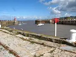 Although the outward terminal of the line was to be the quay at Watchet, the west pier had been practically unusable for some considerable time, and boats were beached and loaded direct from carts brought on to the foreshore.[30] After considerable public pressure, the Watchet Harbour Act 1857 (20 & 21 Vict. c. cxli) was passed, placing the harbour under the control of commissioners; they built a new east pier and rebuilt the west pier; the work was finished in 1862, and 500 ton vessels could enter the harbour.[31] The WSMR used the west pier, and the newly arrived, broad gauge West Somerset Railway, a branch from the Bristol and Exeter Railway, used the east pier.[32][33][34]
