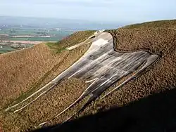 Westbury White Horse or Bratton White Horse is a hill figure on the escarpment of Salisbury Plain, approximately 1.5 mi (2.4 km) east of Westbury in Wiltshire, England. Located on the edge of Bratton Downs and lying just below an Iron Age hill fort, it is the oldest of eight extant white horses carved in Wiltshire.[1] It was restored in 1778, an action which may have obliterated another horse that had occupied the same slope. A contemporary engraving from around 1772 appears to show a horse facing in the opposite direction that was rather smaller than the present figure. There is, however, no documentation or other evidence for the existence of a chalk horse at Westbury before 1772.
