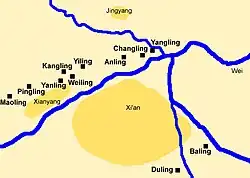 The Western Han dynasty imperial tombs (西汉帝陵; Xīhàn dìlíng) are a series of eleven imperial burial grounds from the Chinese Western Han dynasty (206 BC–24 AD) in Shaanxi Province. Two of the emperor's mausoleums are located southeast of today's Xi'an, which was then the capital of the Western Han dynasty, Chang'an,[1] and the other nine mausoleums are located in a string of pearls in an east–west direction north of the Wei River in Xianyang Prefecture north of Xi'an. The line of tombs stretches from Xingping in the west to Pingling in the east.[2] The nine burial areas can be roughly divided into three districts: the eastern one around Changling with Anling and Yangling, the western one with Maoling and Pingling and the central district around Weiling with Yanling, Yiling and Kangling.[2] There were officially thirteen emperors who ruled the Western Han dynasty. Empress Dowager Lü does not have her own tomb but is buried together in Changling with Liu Bang. It is unclear where the last emperor of the Western Han dynasty, Ruzi Ying, is buried.[3] The construction of the tomb complexes usually started during the respective emperor's second year as regent.[4]