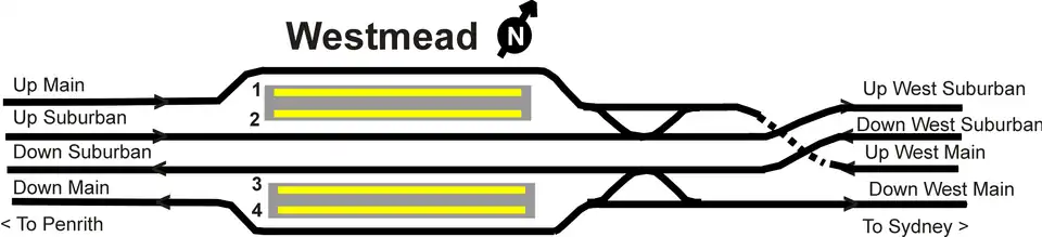 Westmead station opened in March 1883.[3] To the east of the station lies a dive through which one of the eastbound tracks passes. This was opened in 1986 as part of the quadruplication of the Main Western line between Westmead and Granville. It was necessary because west of Westmead the two westbound tracks run adjacent to one another as do the two eastbound tracks. East of Westmead, the westbound and eastbound tracks alternate.[4]