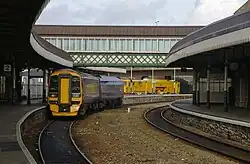 The station itself was refurbished in 1986 with a new booking office.[4] A few years later the canopy was renewed. This saw the removal of a few bays of the canopy at the east end of the station, and the replacement of the hipped canopy by a simpler modern design, although the original cast iron columns support this. Some hipped bays remain on the road side of the station entrance as a reminder of how it all once looked.
