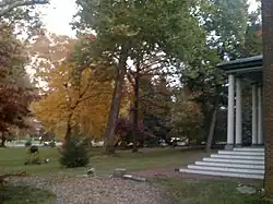 The house is made up of a 2+1⁄2-story, "bilaterally symmetrical", central section, flanked by two, three-story wings set back from the main facade.[30] The roofs of both wings are flat and sloping towards the rear of the house; the northern wing also a "pent roof", a sloped, shingled roof between the first floor and second floor windows, on the rear.[26] The front entrance to Wheatland is sheltered by a portico supported by Tuscan order columns, while the rear entrance is on a veranda.[27]