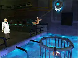 Whiplash is a 2003 platform video game for the PlayStation 2 and Xbox where a long-tailed weasel named Spanx and a rabbit called Redmond find themselves chained to one another and follows their adventures as the pair endeavor to find a way out of the warehouse of the product testing corporation known as Genron, run by the animal-hating CEO Franklin D. Mann. The game is a 3D platformer, with Spanx being controlled by the player for the majority of the game, and Redmond used more in combat or as a means of traversing the world.[3]