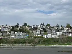 Development was concentrated near the waterfront until the 1960s and 1970s. Many small cliffside dwellings were affordable to those unable to pay the cost of living closer to Vancouver. White Rock gained a reputation for being a retirement centre, as it features the lowest rainfall in the Metro Vancouver region, while benefitting from the influence of the ocean, keeping both summers highs and winter lows bearable.[6]