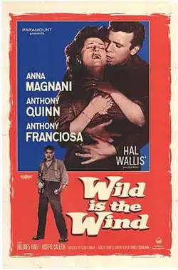 Wild is the Wind is a 1957 American drama film directed by George Cukor and starring Anna Magnani, Anthony Quinn, and Anthony Franciosa. It tells the story of an American rancher who, after his wife dies, goes to Italy to marry her sister, but finds that she falls in love with his young ranch hand.