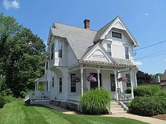 The William E. Alden House is located north east of Southbridge's Globe Village, on the north side of Hamilton Street between its junctions with Hill and Oliver Streets. It is a 2+1/2 story wood-frame structure, with a complex gabled roof and mostly clapboarded exterior. It has a fairly typical Queen Anne Victorian asymmetrical arrangement of projections, and a porch with turned posts and a spindled valance that extends across part of the front and left sides. Some of the gables have been clad in decorative shingles, and have Stick style woodwork adorning them. At the rear of the property is a period carriage house, finished in board and batten siding. It is topped by a gable roof with cupola, and has a decorative balcony on its main facade.[2]