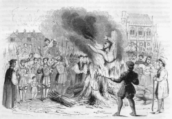 And thus fire was set unto him, who burning therein, cried with a loud voice, "O the Son of God, have mercy upon me! O the Son of God, receive my soul!" three times; and so his speech being taken from him, he spake no more, lifting up, notwithstanding, his stump with his other arm, as long as he could. And thus endured this constant witness and faithful servant of God the extremity of the fire, being therein cruelly handled, by reason that to his burning little wood was brought; so that for lack of faggots, there being not sufficient to burn him, they were fain to strike him down into the fire; where he lying along (which was doleful to behold) upon the ground, his nether part was consumed in the fire, whilst his upper part was clean without the fire, his tongue in all men's sight still moving in his mouth.[1]